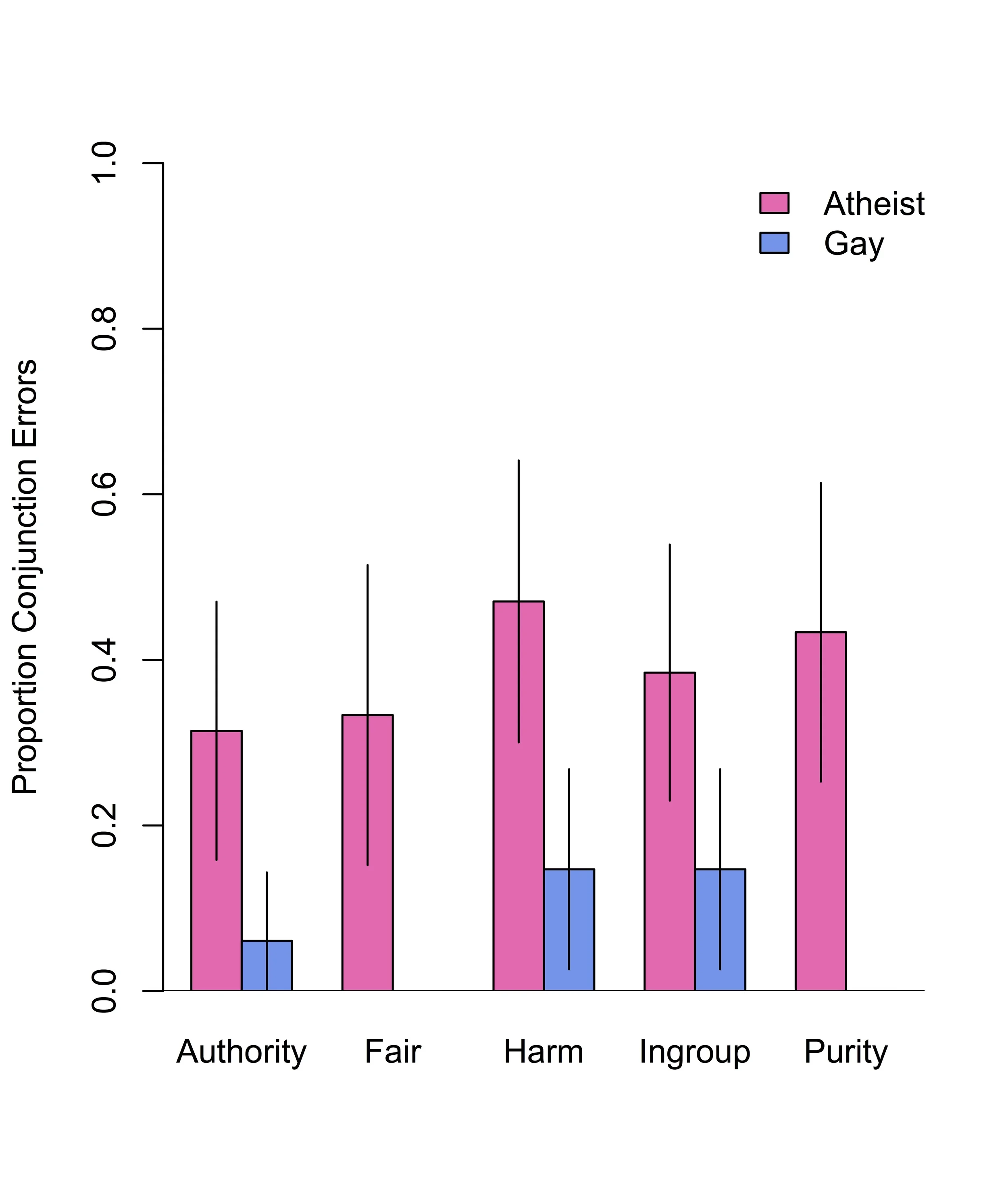 Participants readily picked Option 2 in all of these cases when XXXXXX was "an atheist (someone who does not believe in God)." Just as the description of Linda makes people--at a gut reaction level--think "hmmmm...sounds a bit feminist-ey" descriptions of all sorts of moral violations made people think "hmmmm....sounds a bit atheist-ey." But, participants would not pick Option 2 frequently when XXXXXX was another disliked group (gay). Here's a graph of that -->