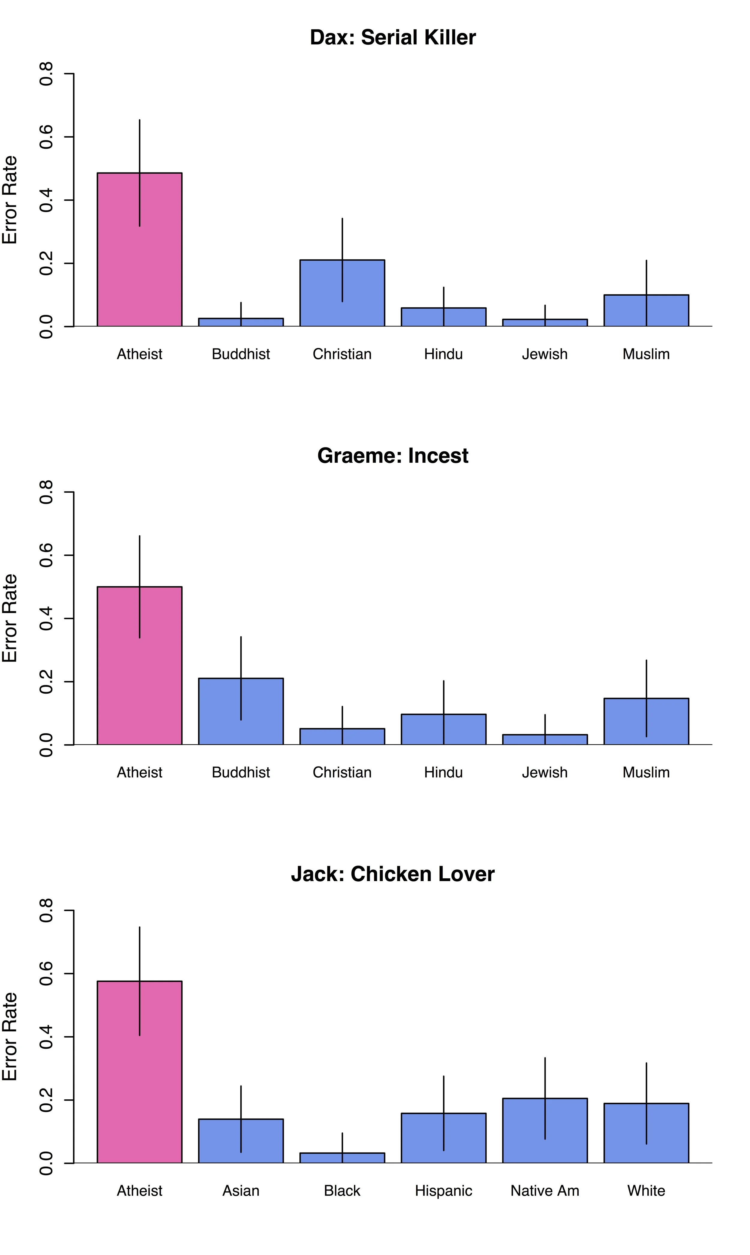 Finally (actually, this one is Experiment 1 in the paper...I decided to present the studies chronologically in terms of when I ran them for this post), I decided to give people a description of someone doing something that is clearly, unambiguously, incontestably immoral, just to see if I could find something soooo bad that my participants wouldn't think even an atheist would want to do it. Enter...Dax.