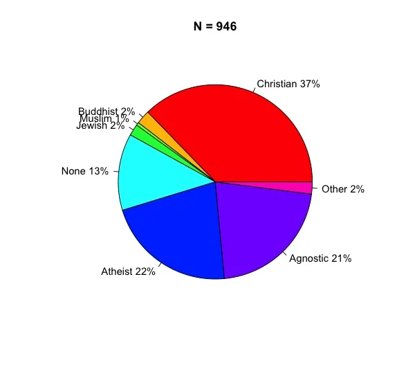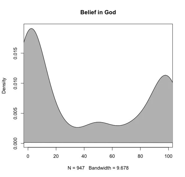 It turns out that the participants were all recruited from Amazon's Mechanical Turk service. They aren't a particularly religious bunch either. I asked everyone to list their religious affiliations and to rate their strength of belief in God from 0 (God definitely doesn't exist) to 100 (God definitely exists). And here is my sample makeup across studies: