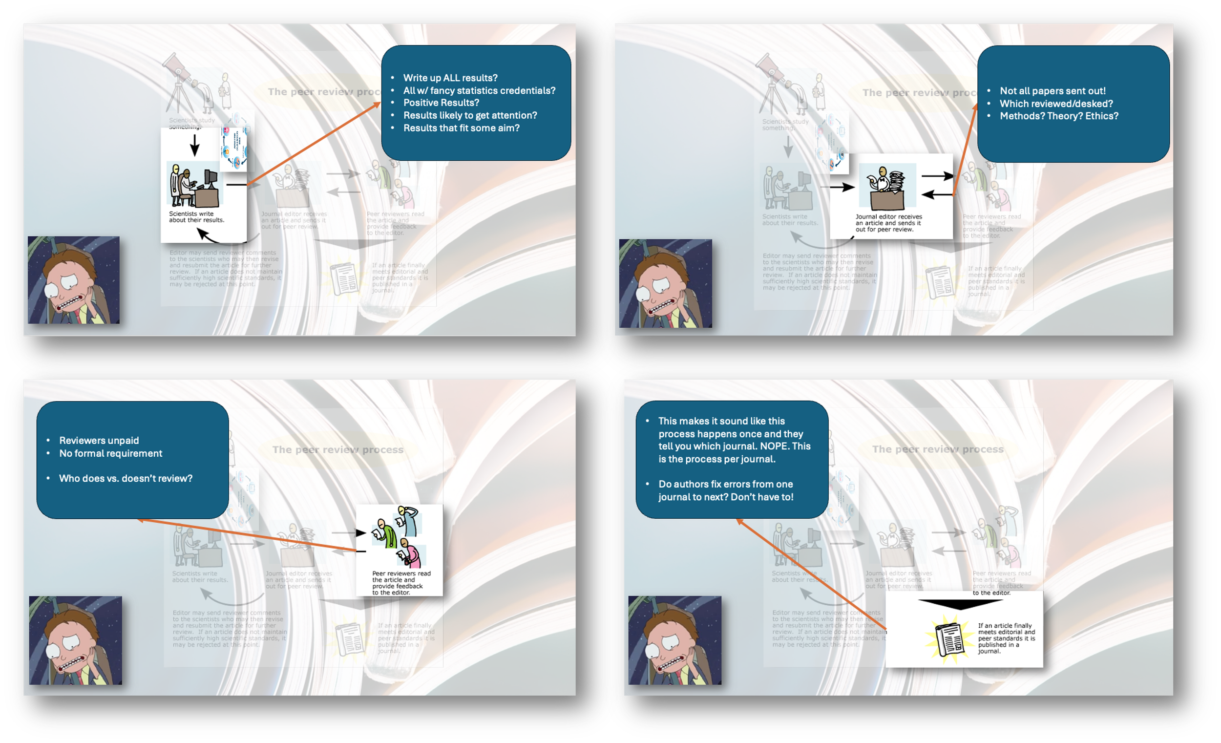 Then I had some fun with image transparency in Powerpoint[2] to do little call-outs on where peer review (actual) falls short of Peer Review™