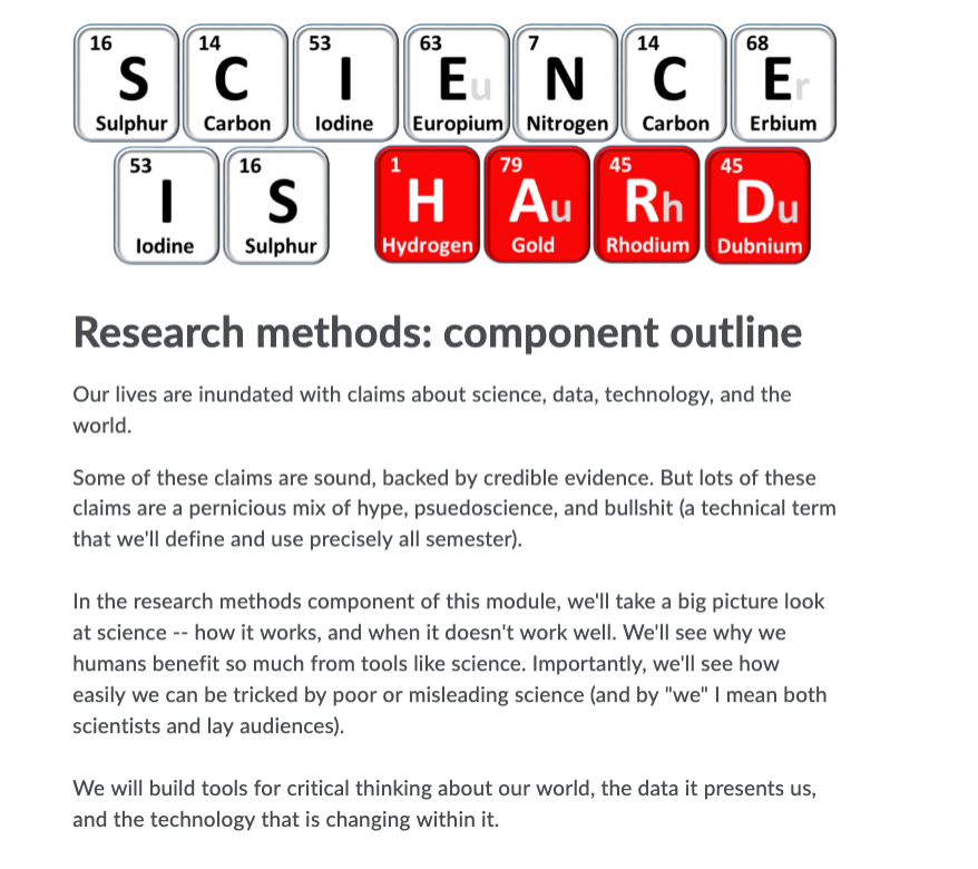 For some years now, I’ve wanted to do a hybrid cognitive science and methodology module that simultaneously teaches students a bit about how humans think (for better or worse), and how science and critical thinking are mental prostheses that help us think better. Sort of a Calling Bullshit setup, but with a more overtly psychological and cognitive science bent.