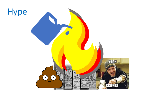 With hype of course being the gasoline on a fire, whether that’s a science fire, a pseudoscience fire, or a bullshit fire. Hype just burns, it doesn’t just target claims with certain evidentiary standards.