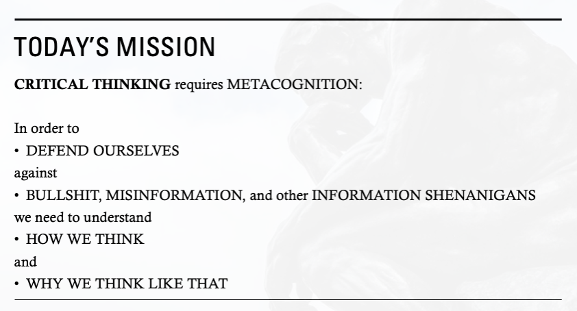 Basically, I wanted to A) show students how we can all think poorly, B) give them some tools to think better, and C) convince them to adopt a mindset where they’re applying these skills. C, naturally, is the most important – there’s a persuasive aspect to teaching critical thinking, as everyone already has skills here that they just need to kick into gear.