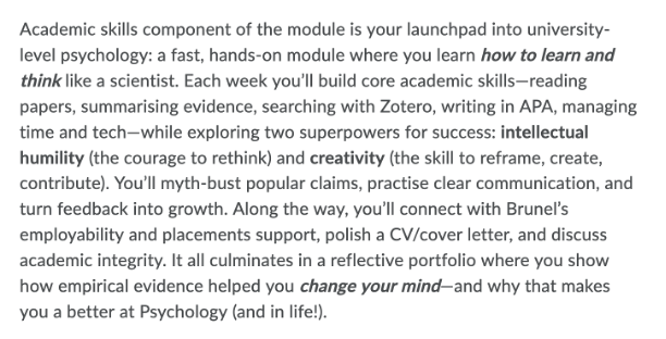 These three blocks of modules span every psychology student’s first, second, and third semesters on campus. They’re the bridge from students fresh off A-levels and arriving on campus to students starting to think about placements and dissertations. The skills built in modules like this also flow outward to the rest of the curriculum – better scientific thinking makes it easier to teach people scientific topics, go figure.