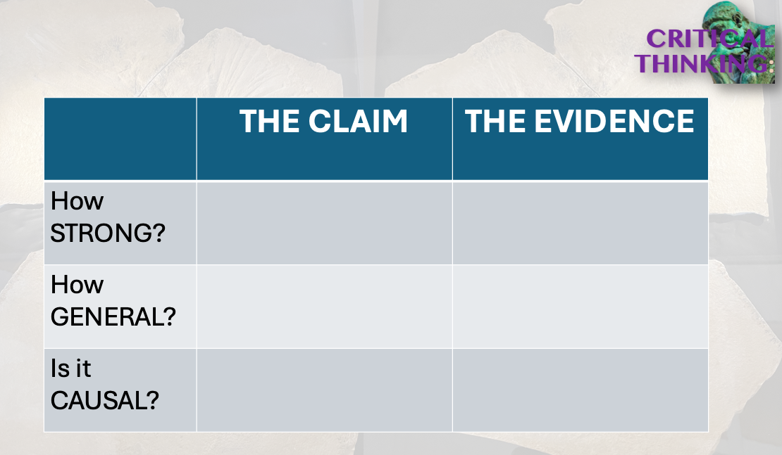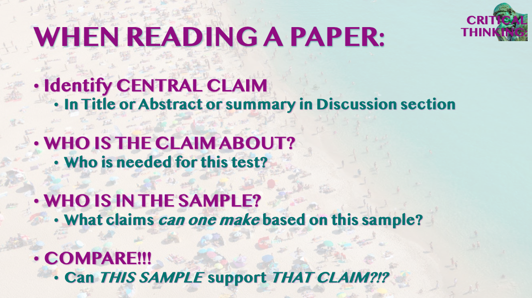 Overall, I tried to get my students thinking about evidence in terms of the claims being made in a paper. Lots of claims might be fine with a small cross-sectional convenience sample; for other claims this would be absurdly inappropriate. EVIDENCE is relative to CLAIM, which means that critical thinking is all about the fit between the two. It’s about calibration.