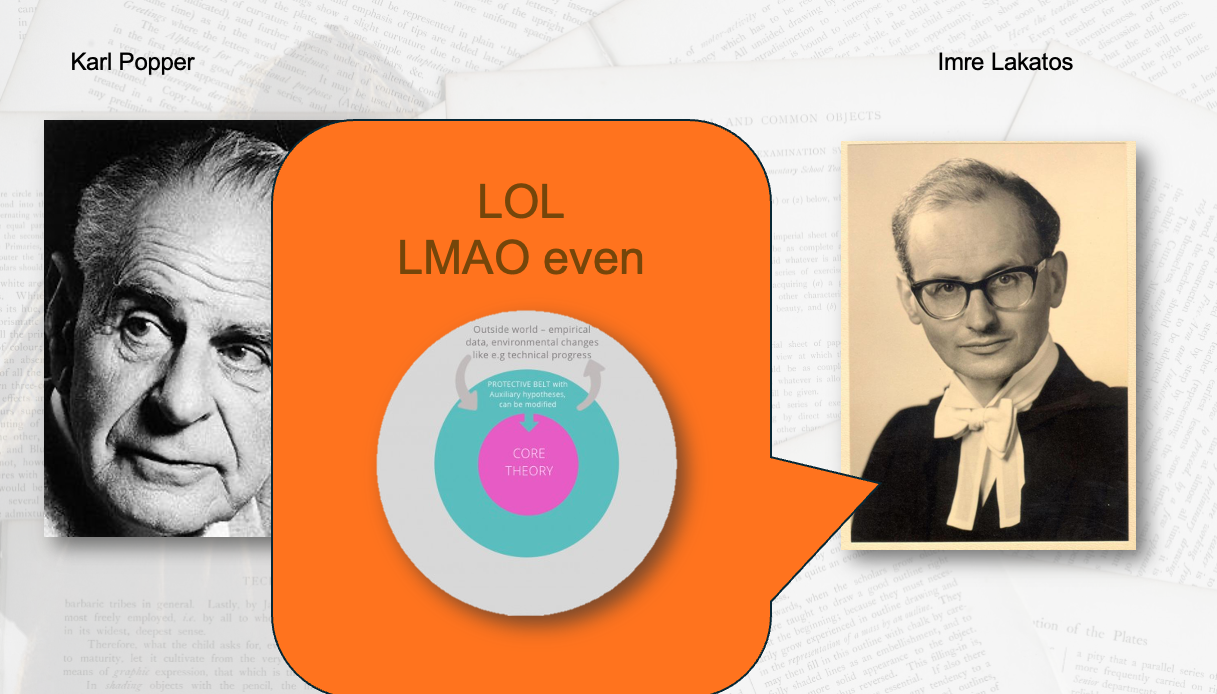 All this talk of theory, hypothesis, and assumption opened the door for a nice li’l conversation on philosophy of science; how the naïve Popperian “science is science cuz falsifiable” fiction isn’t taken all that seriously by modern philosophers of science, but that some/many/most psychs don’t read philosophy of science – some proudly!