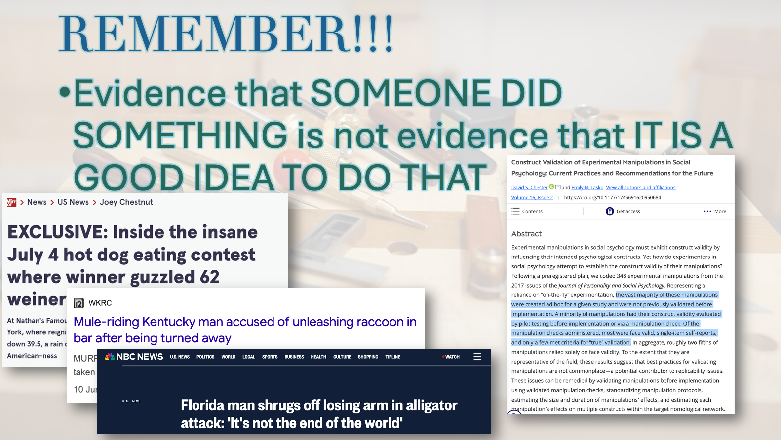 We chatted about how many papers will provide no more evidence that their measure/manipulation worked than simply citing someone else who has also used these tasks – but that if you go citation hunting you’ll find that the cited paper ALSO DIDN’T VALIDATE SHIT! I reminded the students that in other walks of life “someone did this once” is not taken to be synonymous with “this is good to do.”