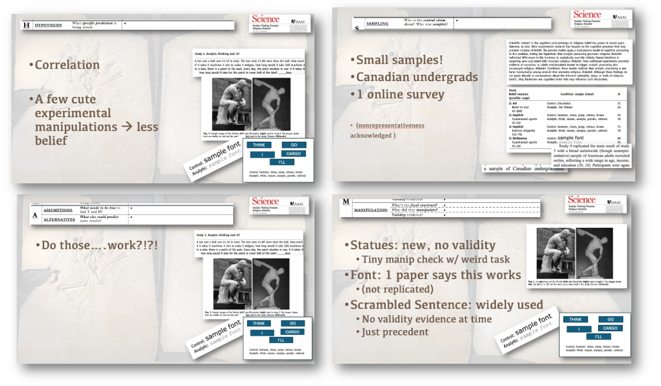 Looking back, I think my favorite letter that we kept looping back to was the ASSUMPTIONS that separateTHAMES from THEMS. Really, it’s assumptions all the way down. Assumptions that link the theory to the hypothesis. Assumptions that link the measurement tools to the numbers they generate. Assumptions that the manipulation does what it’s billed as doing, and only that. Assumptions that the sample is appropriate . And these assumptions are the easiest things to hide, often especially from ourselves! So they’re the most important thing to think critically about! Assumptions, done well, are transparent and justified with evidence; done wrong, they are hidden, unjustified, and fatal to serious inquiry. It seemed empowering to the students that they could spot assumptions in my bad Science paper, and see their concerns vindicated by replication results. So I really hope that long after they’ve forgotten the difference between convergent and divergent validity, they remember that it’s assumptions all the way down, with posterior potential we mightn’t like for U and ME.
