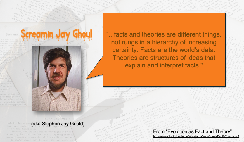 We chatted about how theories are the grand unifying conceptual structures of science, linking together observations and making sense of them. This is different from a hypothesis, which is usually the small idea being tested in a given study. This lecture ended up happening near Halloween time, so everything was a bit….thematic.