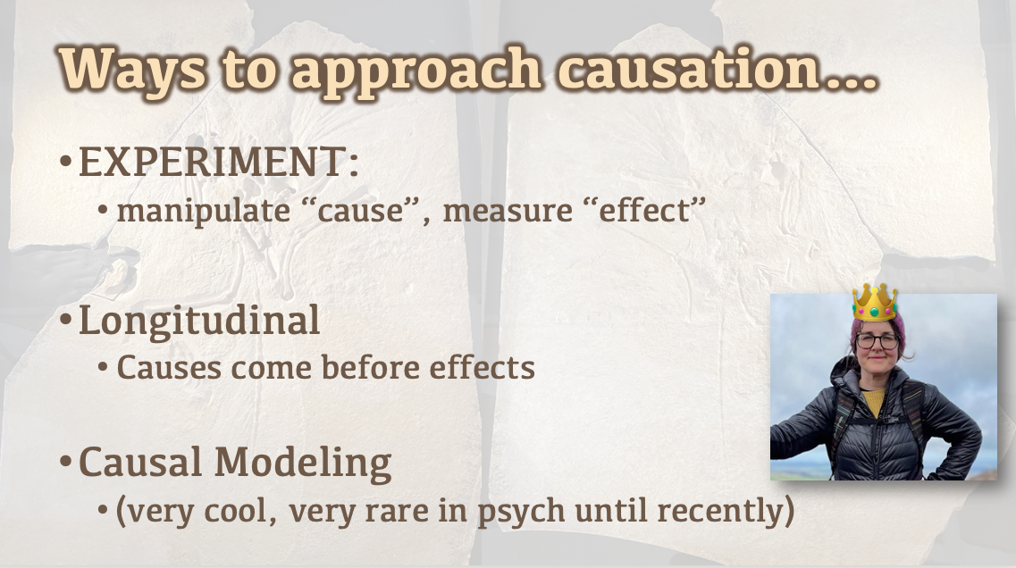 If you want to make a causal claim, you’ve gotta do one of a few things: run an experiment, think about time, or do some causal modeling (shout out to Queen Abbey, who is teaching some causal modelling, no DAGgity).